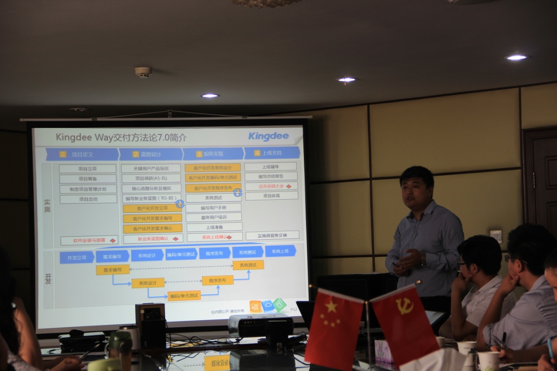 通過會議溝通,雙方共同確立了實(shí)施的相關(guān)事項(xiàng)、確定了各項(xiàng)目小組成員,金蝶方項(xiàng)目總監(jiān)做了“項(xiàng)目實(shí)施方案”和“金蝶實(shí)施方法論”的主題講解。