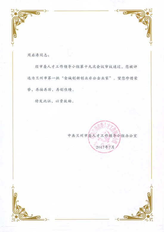 2017年11月22日,甘肅中集實業(yè)集團(tuán)有限公司董事長周啟濤榮膺蘭州市首屆“金城創(chuàng)新創(chuàng)業(yè)非公企業(yè)家”;
